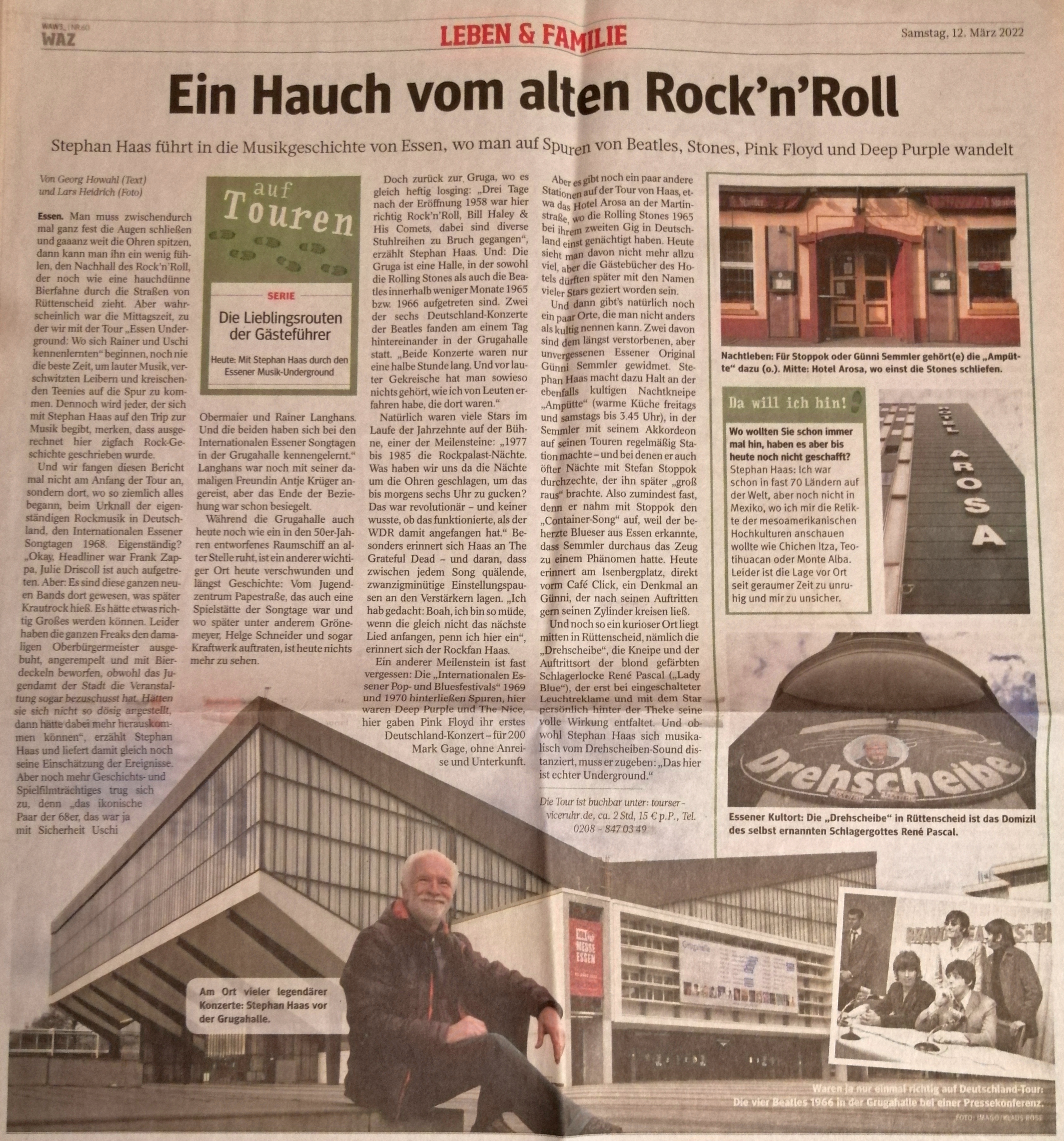 Die Underground-Führung durch Essen-Rüttenscheid handelt schwerpunktmäßig von den legendären Veranstaltungen in der Essener Grugahalle wie den Essener Songtagen, das Pop & Blues Festival oder den Rockpalast-Nächten.
